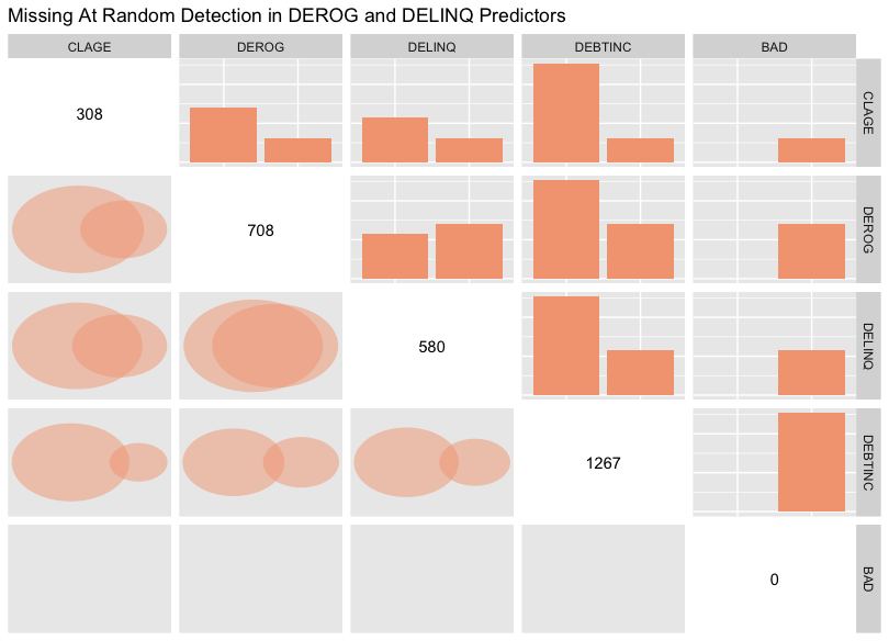 DEROG, DELINQ, DEBTINC, CLAGE, target BAD): The diagonal plots display the count of missing data for each variable. The upper triangle plots shows side-by-side bar plots of missing values counts within and across pairs of variables. The lower triangle uses Venn diagrams to depict the proportion of mutually missing information within each pair.The pattern suggests that missingness in DELINQ (number of delinquent credit lines) and DEROG (number of derogatory reports) is correlated (MAR), with missing values often occurring in tandem. When missingness occurs randomly across both defaulters and non-defaulters, as seen in CLAGE (age of oldest credit line in months), it is categorised as MCAR.
