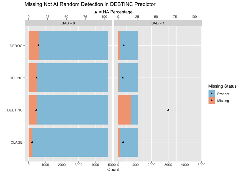 DEROG, DELINQ, DEBTINC, CLAGE), segmented by the BAD outcome (0 for no default, 1 for default). A significant discrepancy in missing data is observed in DEBTINC (debt-to-income ratio), particularly between non-defaulters (BAD = 0) and defaulters (BAD = 1), with defaulters less likely to report their debt-to-income ratio.This pattern suggests that the missingness in DEBTINC is informative and correlates with the likelihood of default. Thus, imputing missing DEBTINC values could introduce bias into the model.