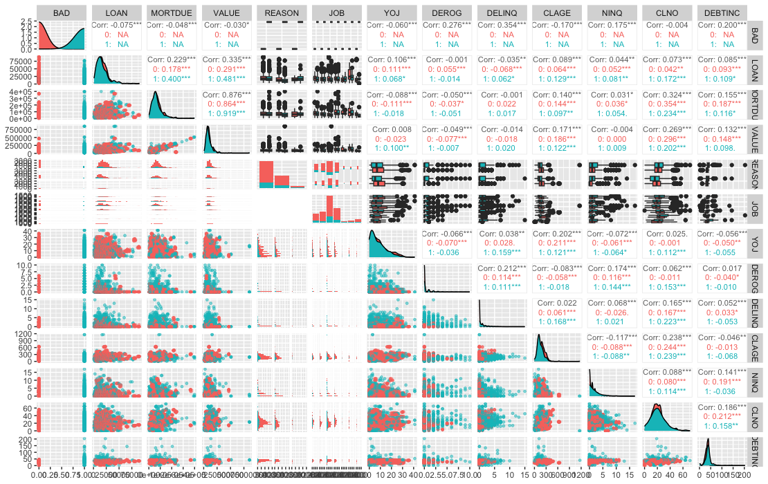 The correlation matrix below illustrates relationships between variables in the dataset and their interactions within each class of the target variable, BAD. Pearson correlation results help identify which variables are most effective for class discrimination. Additionally, multicollinearity—where predictors are highly correlated and can negatively impact model performance—is detected through these pairwise distributions.